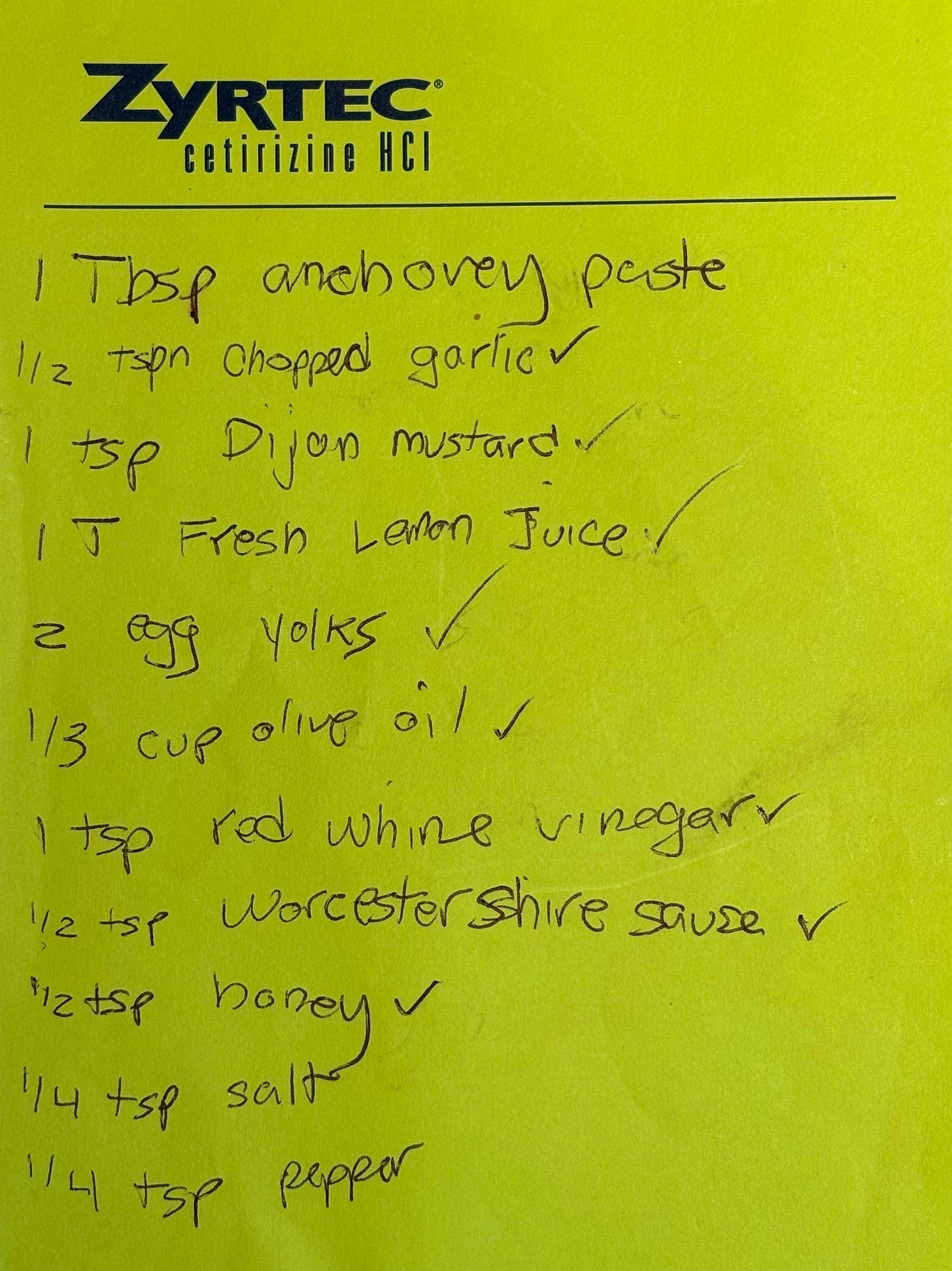 In the back of the book, where Molly rather helpfully compiles recipes for all the different dressings and toppings that garnish her dishes, I discovered a recipe for what she calls “Caesar-ish Dressing.”5 The ingredients were pretty familiar — garlic, anchovy, dijon mustard, lemon juice — but with one surprising ingredient: 2/3 cup of mayonnaise.